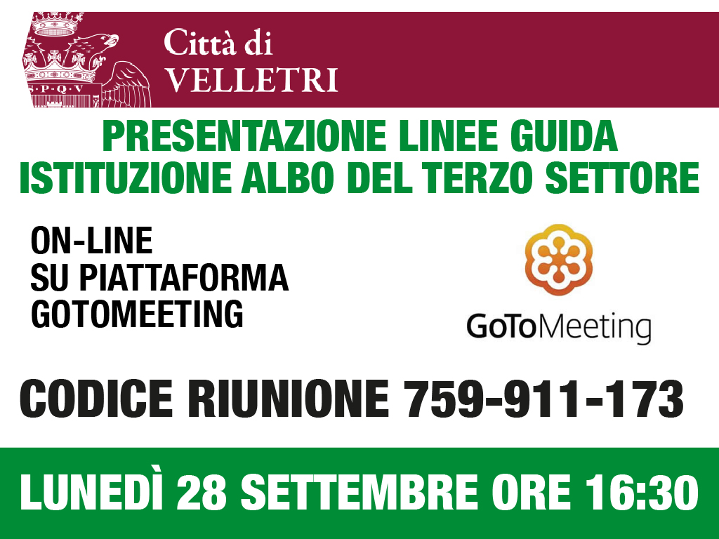 Il giorno 28 settembre p.v. alle ore 16.30 in modalità telematica, mediante il software GoToMeeting, si terrà un incontro pubblico finalizzato alla presentazione e condivisione delle "Linee guida per l'istituzione dell'Albo degli Enti del Terzo Settore".