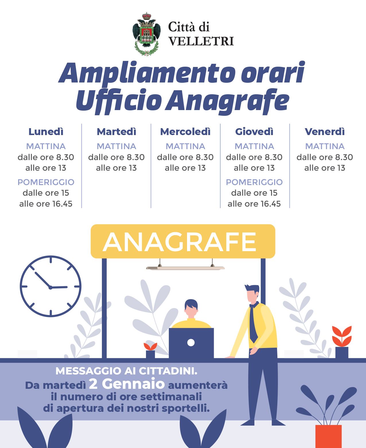 Si comunica che l'ufficio Anagrafe dal 2 Gennaio sarà aperto al pubblico nei seguenti giorni ed orari: dal LUNEDI' al VENERDI' dalle 08,30 alle 13,00 - il LUNEDI' e il GIOVEDI' anche dalle 15,00 alle 16,45