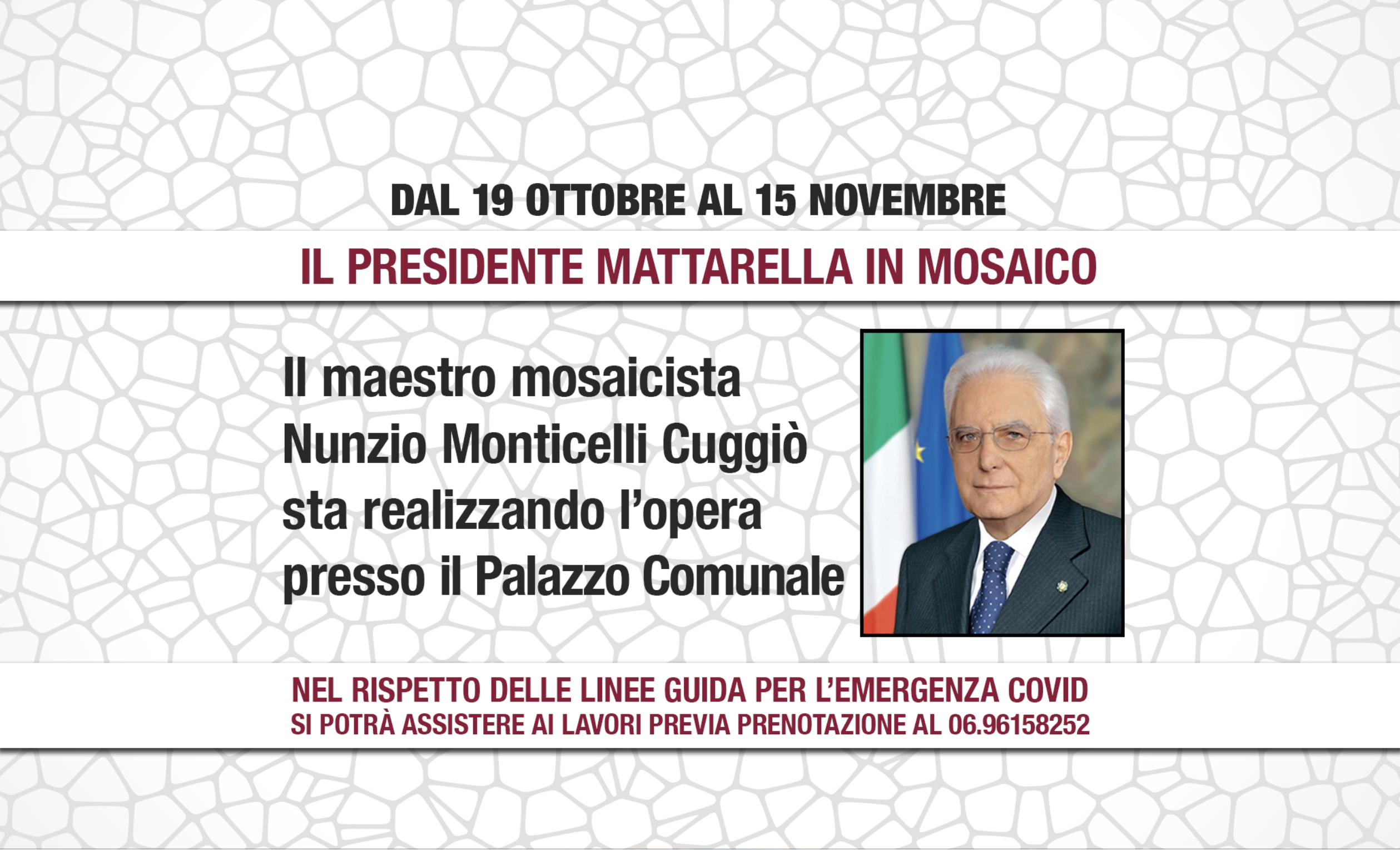 Il maestro mosaicista Nunzio Monticelli Cuggiò sta realizzando l'opera del ritratto del Presidente Sergio Mattarella presso il Palazzo Comunale. Si potrà assistere alla realizzazione della stessa dal 19 ottobre al 15 novembre p.v. previa prenotazione al 06.96158252.