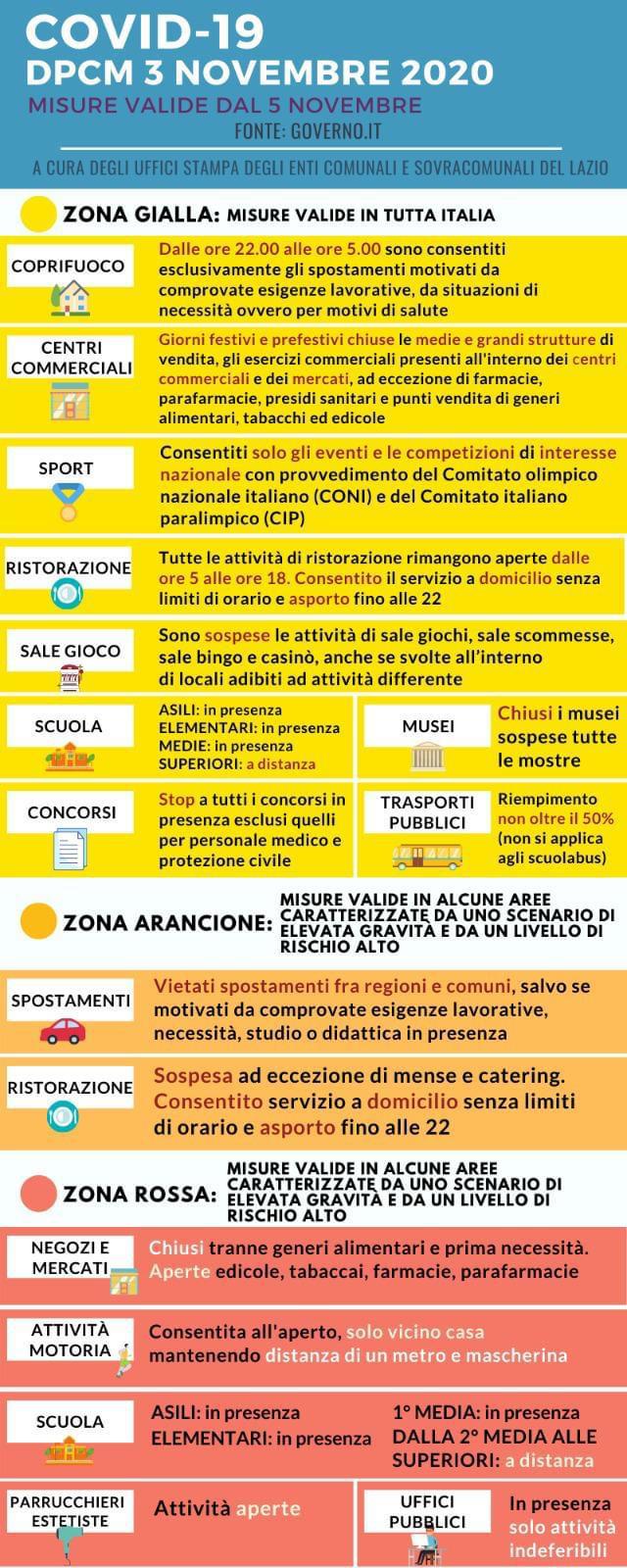 Il Governo ha pubblicato il testo del nuovo DPCM del 3 novembre che puoi leggere qui. Una sintesi grafica delle principali decisioni che interessano i cittadini. Misure valide dal 6 novembre 2020