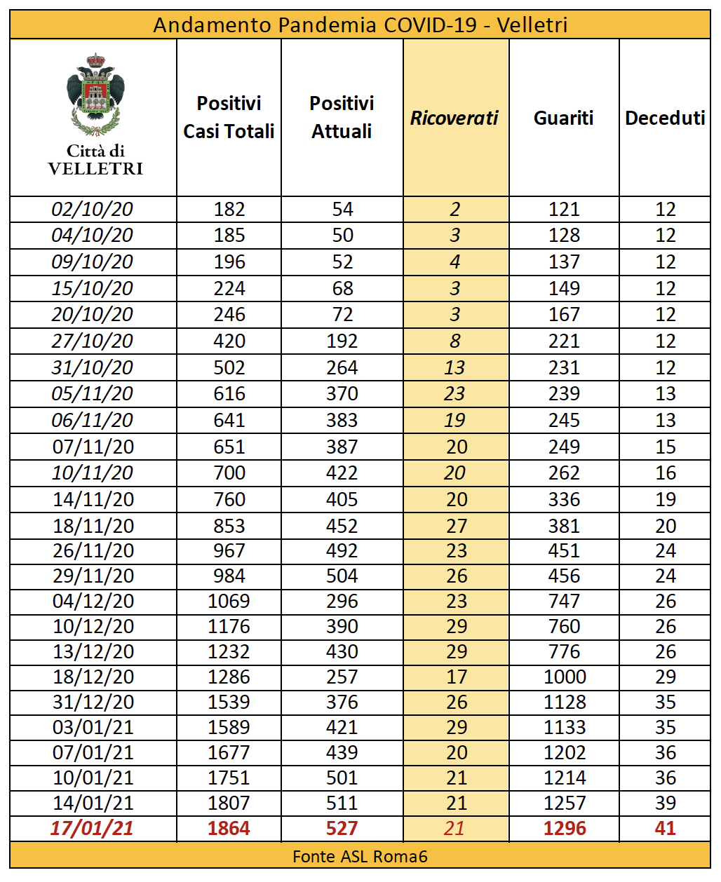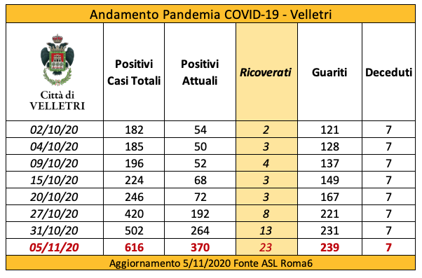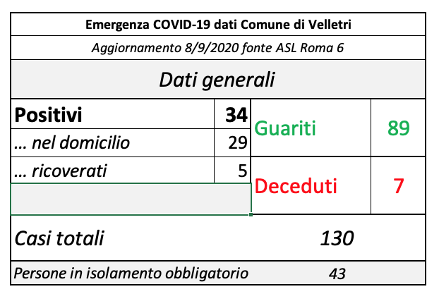 In seguito alla segnalazione del Comune di Velletri e dopo un lavoro attento di bonifica dei dati, è stata aggiornata la tabella della pandemia a Velletri. Il numero delle persone attualmente positivi si è ridotto drasticamente come già accaduto in altri comuni. Prima di procedere con la comunicazione formale abbiamo anche fatto un confronto con i dati rilevati dalla Volsca che è impegnata nella raccolta speciale dei rifiuti presso le famiglie dei cittadini colpiti dal virus. La compatibilità di tutte le informazioni ci consente di eseguire una fotografia attendibile e anche confortante vista la curva in crescita delle ultime settimane. Purtroppo, si registrano 2 decessi in più rispetto alla precedente rilevazione.