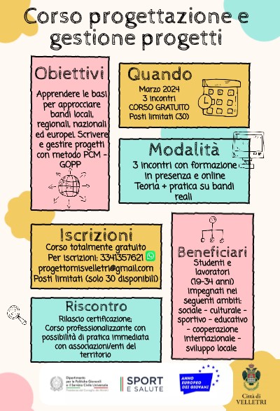 Sono aperte le iscrizioni al corso, gratuito, con l'obiettivo di apprendere le basi per approcciare bandi locali, regionali, nazionali ed europei. Scrivere e gestire progetti con merodo PCM-GOPP. Per iscriversi contattare il numero 3341357621.