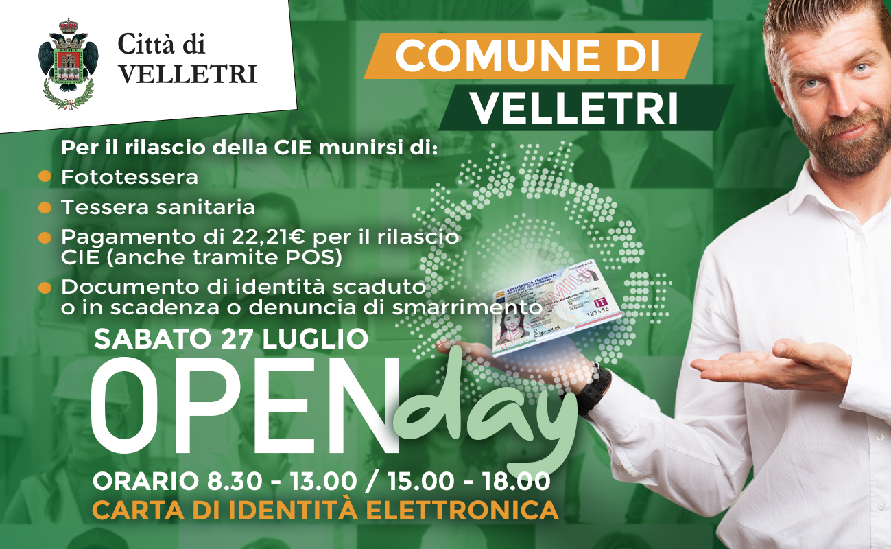 Si comunica che per il giorno Sabato 27 luglio è stato programmato un Open Day presso l'Ufficio Anagrafe dalle ore 08:30 alle 13:00 e dalle ore 15:00 alle 18:00 per il rilascio della Carta d'Indentità Elettronica (CIE).