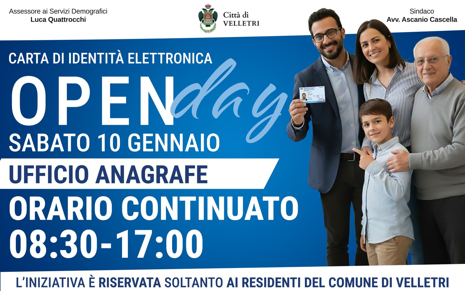Il Comune di Velletri informa i cittadini che sabato 10 gennaio, presso l’Ufficio Anagrafe, si terrà un Open Day dedicato al rilascio della Carta di Identità Elettronica (CIE).